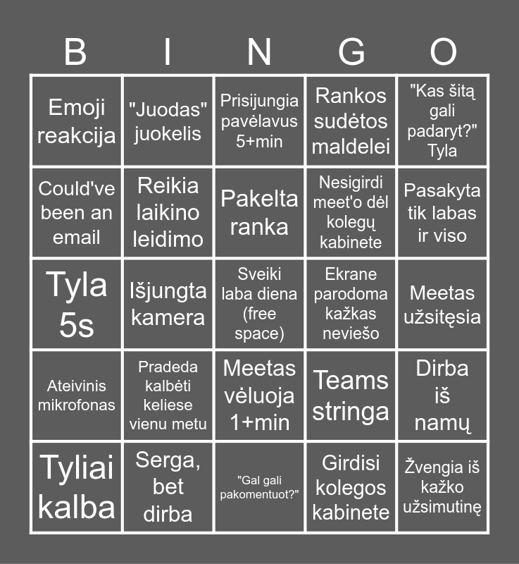 This bingo card has a free space and 42 words: Kalba užsimutinę, Pakelta ranka, Pertraukinėja, Pradeda kalbėti keliese vienu metu, Girdisi kolegos kabinete, Dirba iš namų, Žvengia iš kažko užsimutinę, "Atsiprašau turiu atsijungti", Prisijungia pavėlavus 5+min, Meetas vėluoja 1+min, Meetas užsitęsia, Pasakyta tik labas ir viso, Išjungta kamera, "Kas šitą gali padaryt?" Tyla, Kažką rodo, bet pamiršo pasharint screen, Teams stringa, Meetas pasibaigia neįpusėjęs, Tyla 5s, Nejuokingas juokelis, "Juodas" juokelis, Could've been an email, Ginčas, Dingsta iš meeto be jokių žinių, Emoji reakcija, Rašinėja į meeto chat'ą, Techniniai nesklandumai, Nesigirdi meet'o dėl kolegų kabinete, "Ar matot ekraną?", Virtualus background, "Atsiprašau praklausiau", Nukrypsta nuo temos, Ateivinis mikrofonas, Reikia laikino leidimo, "Gal gali pakomentuot?", Accepted, bet nedalyvauja, Tyliai kalba, Serga, bet dirba, Ekrane parodoma kažkas neviešo, "Nebent kažkas mato kitaip", Prašo pasilikti po meet, Rankos sudėtos maldelei and Kalba su kažkuo ne meet'e.
