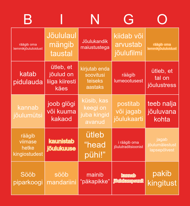This bingo card has a free space and 24 words: Sööb piparkoogi, kaunistab jõulukuuse, kirjutab enda soovitusi teiseks aastaks, kannab jõulukampsunit, räägib oma lemmikjõulutoidust, räägib oma lemmikjõulutoidust, Jõululaul mängib taustal, Jõulukandik maiustustega, postitab või jagab jõulukaarti, teeb nalja jõuluvana kohta, kannab jõulumütsi, ütleb, et jõulud on liiga kiiresti käes, i räägib oma jõulutraditsioonist, jagab jõulumälestust lapsepõlvest, katab pidulauda, sööb mandariini, mainib “päkapikke”, kiidab või arvustab jõulufilmi, ütleb, et tal on jõulustress, räägib viimase hetke kingiostudest, joob glögi või kuuma kakaod, ütleb “head pühi!”, räägib lumeootusest and pakib kingitust.