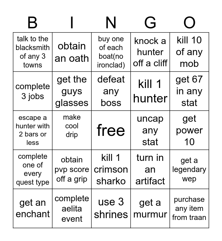 This bingo card has a free space and 24 words: obtain pvp score off a grip, complete aelita event, defeat any boss, get an enchant, kill 10 of any mob, talk to the blacksmith of any 3 towns, complete 3 jobs, obtain an oath, uncap any stat, kill 1 crimson sharko, kill 1 hunter, escape a hunter with 2 bars or less, turn in an artifact, get a legendary wep, get the guys glasses, get a murmur, get power 10, buy one of each boat(no ironclad), get 67 in any stat, make cool drip, purchase any item from traan, complete one of every quest type, knock a hunter off a cliff and use 3 shrines.