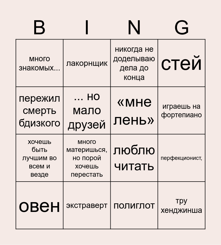 This bingo card has 16 words: овен, экстраверт, никогда не доделываю дела до конца, стей, пережил смерть бдизкого, лакорнщик, люблю читать, перфекционист,, много знакомых..., ... но мало друзей, полиглот, играешь на фортепиано, хочешь быть лучшим во всем и везде, много материшься, но порой хочешь перестать, «мне лень» and тру хенджинша.