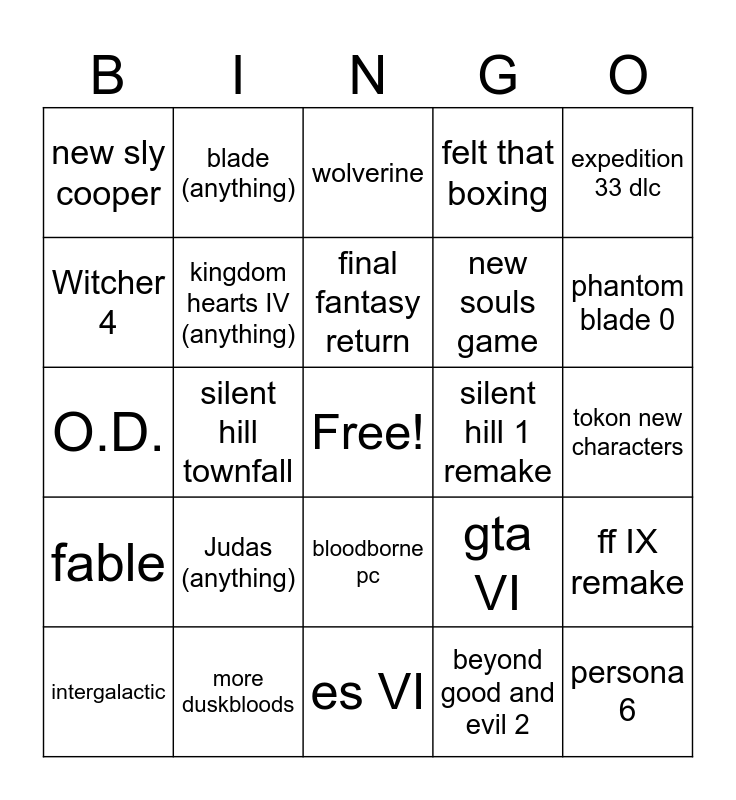 This bingo card has a free space and 24 words: Judas (anything), more duskbloods, final fantasy return, intergalactic, expedition 33 dlc, new sly cooper, Witcher 4, blade (anything), silent hill 1 remake, bloodborne pc, new souls game, O.D., gta VI, ff IX remake, kingdom hearts IV (anything), beyond good and evil 2, tokon new characters, wolverine, phantom blade 0, silent hill townfall, persona 6, fable, felt that boxing and es VI.