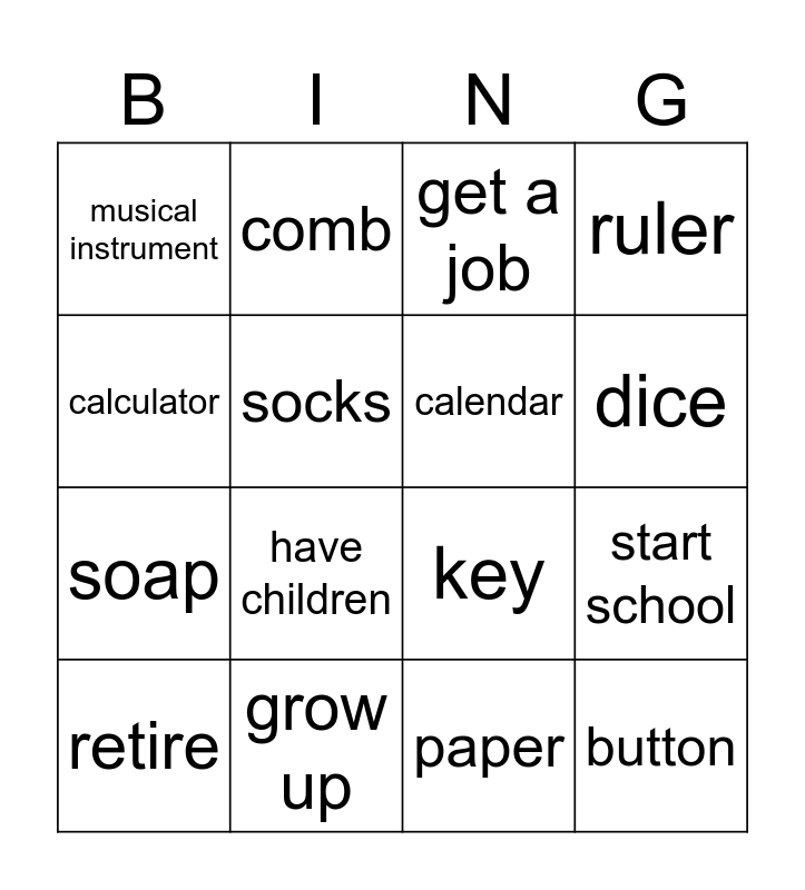 This bingo card has 34 words: alarm clock, artificial, be born, board game, button, calendar, calculator, chewing gum, comb, cup, dice, get a job, get married, go to university, grow up, have children, helmet, key, knife and fork, leave school, mirror, move house, musical instrument, paper, purse, retire, ruler, scissors, soap, socks, spoon, start school, sunglasses and toothbrush.