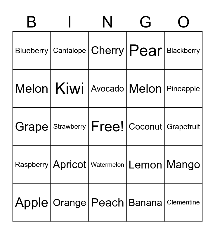 This bingo card has a free space and 24 words: Apple, Apricot, Avocado, Banana, Blackberry, Blueberry, Cantalope, Cherry, Coconut, Grapefruit, Grape, Kiwi, Lemon, Mango, Melon, Orange, Peach, Pear, Pineapple, Raspberry, Strawberry, Watermelon, Melon and Clementine.