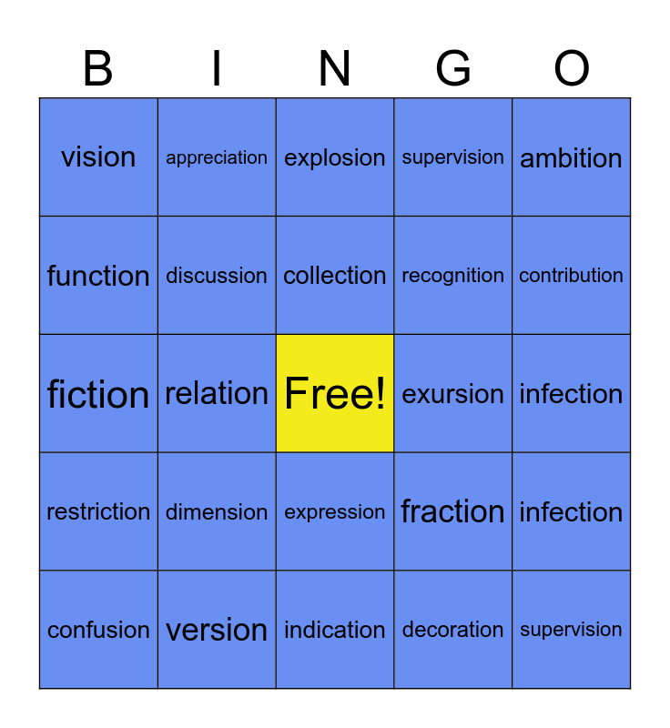 This bingo card has a free space and 29 words: confusion, collection, relation, division, vision, explosion, discussion, dimension, exursion, version, infection, supervision, indication, decoration, contribution, subtraction, expression, restriction, ambition, fiction, fraction, precaution, recognition, function, supervision, appreciation, infection, collection and subtraction.