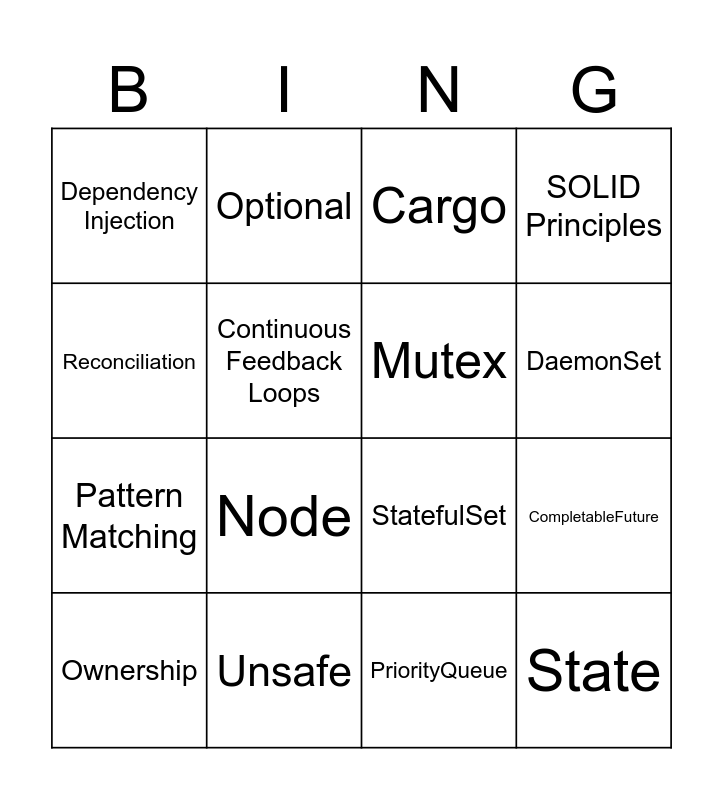 This bingo card has 139 words: Free!, JVM, JDK, JRE, Garbage Collection, Maven, Gradle, Streams, Lambda Expressions, Multithreading, Concurrency, Serialization, Deserialization, Reflection, Annotations, Generics, Singleton Pattern, Factory Pattern, Builder Pattern, Polymorphism, Encapsulation, Abstraction, Inheritance, Dependency Injection, ExecutorService, CompletableFuture, Optional, HashMap, TreeMap, ArrayList, LinkedList, HashSet, LinkedHashSet, PriorityQueue, Comparator, Comparable, try-catch, finally, Thread Pool, Volatile, Synchronized, Pod, Node, Cluster, Deployment, Service, Ingress, ConfigMap, Secret, Helm, Namespace, StatefulSet, DaemonSet, ReplicaSet, Persistent Volume, Persistent Volume Claim, kubelet, kube-proxy, etcd, Horizontal Pod Autoscaler, Kubernetes Control Plane, Singleton, Factory, Observer, Strategy, Decorator, Adapter, Repository, Command, Prototype, Dependency Injection, Microservices, Event-Driven, Domain-Driven Design, Test-Driven Development, Behavior-Driven Development, RESTful, SOLID Principles, Clean Code, Extreme Programming, JSX, Virtual DOM, Component, Props, State, Hooks, useEffect, useState, useReducer, Context API, Redux, React Router, Functional Components, Error Boundaries, Reconciliation, Prop Drilling, Lazy Loading, Suspense, Suspense List, Goroutine, Channel, Mutex, Struct, Interface, Defer, Concurrency, Slice, Package, Error Handling, Ownership, Borrowing, Cargo, Crate, Trait, Lifetime, Unsafe, Pattern Matching, Macro, Asynchronous, Scrum, Sprint, Backlog, User Story, Epic, Standup, Retrospective, Cross-Functional Teams, Kanban, Burndown Chart, Iteration Retrospective, Team Velocity, Agile Release Planning, Technical Debt Management, Continuous Feedback Loops, Backlog Refinement, Agile Roadmap, Sprint Goal, Cadence Meetings and Incremental Value Delivery.