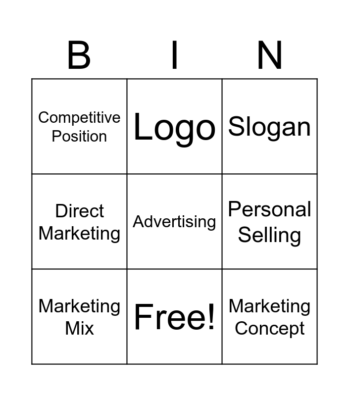 This bingo card has 9 words: Marketing Mix, Advertising, Slogan, Competitive Position, Logo, Personal Selling, Direct Marketing, Free! and Marketing Concept.