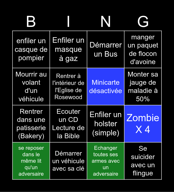 This bingo card has 211 words: Tuer 40 Zombies, Se couper un bras, Allumer la sirène et les gyrophares d'une voiture de police, Tirer avec un fusil à pompe, Trouver un fusil d'assaut, Récupérer 50 de monnaie, Achever 3 joueurs, Trouver une hache de pompier, Construire une caisse en bois, Démarrer un Bus, Démarrer un Poids Lourd, Pécher un poisson, Détruire un mur avec la masse, Brancher un groupe électrogène, Trouver un rubik's cube, Enfiler une montre de luxe, Accrocher une remorque à votre véhicule, Tuer 20 zombies avec un véhicule, Démarrer la voiture chien, Regarder en entier une VHS Woodcraft, Regarder en entier une VHS Carzone, Avoir 200 clopes dans son inventaire (cartouche), Faire le plein à une station essence, Placer une tente, Allumer un feu de camp, Se suicider avec un flingue, Trouver un saxophone, Trouver un sifflet, Démarrer un véhicule avec sa clé, Démonter une télévision ValuTech, Porter un sac de randonnée (PAS LE GRAND), Porter un Grand sac de randonnée, Trouver un Talkie Walkie, Recoudre une plaie, Tomber en panne d'essence, Manger un donuts, Manger une saucisse pourrie, Manger une souris, Trancher une pastèque en morceau, Manger une viande séchée (PAS UN MORCEAU), Trouver un violon, Trouver une trompette, Déclencher l'action "se reposer" dans une église, Tuer un zombie dans une église, Déclencher une alarme de maison, Déclencher une alarme de voiture, Trouver l'antidote, Trouver une arme à feu sur un zombie, Tuer un zombie habillé en policier, Tuer un zombie habillé en pompier, Lire le magazine érotique, Achever un joueur avec une poêle, Achever un joueur, Tuer un zombie avec un couteau, Sprinter dans une fenêtre du premier étage, Sprinter dans une fenêtre du deuxième étage, Se faire infecter par un zombie, Monter sa jauge de maladie à 50%, Rentrer dans l'enceinte de Louisville, Traverser le pont de la liberté (nord de Louisville), Démarrer un camion de pompier, Passer 2 niveaux en premier secours en jeu, Passer 3 niveaux en menuiserie en jeu, Passer 1 niveau en mécanique en jeu, Atteindre le niveau 2 en électricité, Ecouter un CD Lecture de la Bible, Ecouter un CD de citations philosophiques, Ecouter un CD sur les moments de l'histoire américaine, Lire un livre lambda, Démonter une roue d'un véhicule, Remplacer le phare d'un véhicule, Enterrer un zombie, Enfiler des bottes millitaires, Enfiler une montre digitale rouge, Enfiler un collier en or, Enfiler un noeud papillon, Enfiler un masque à gaz, Enfiler un masque anti poussière, Barricader complétement une fenêtre (un côté suffit), Barricader complétement une porte (un côté suffit), Tuer 10 zombies avec une poêle, Tuer 30 zombies avec une arme à feu, Démarrer avec le trait mule, Manger un aliment brûlé, Mourrir au volant d'un véhicule, Fabriquer 10 branches d'arbre solide, Descendre de 2 étages à l'aide d'une corde de drap, Rentrer à l'intérieur de l'Eglise de Rosewood, Rentrer à l'intérieur de la prison de Rosewood (batiment du haut), Rentrer dans une maison de survivant, Rentrer dans le commissariat de Muldraugh, Mettre un bandage à un adversaire, Effectuer un échange avec un adversaire, S'amputer un bras avec un adversaire, Boire une bière avec un adversaire, Etre nu dans une chambre avec un adversaire, Echanger toutes ses armes avec un adversaire, Blesser un adversaire avec un couteau puis le soigner complètement, Démarrer avec le trait alcoolique, Démarrer avec le trait Blessé, Démarrer avec le trait Surdoué, Démarrer avec le trait Infatigable, Démarrer avec le trait Obèse, Achever un joueur avec une arme à feu, Achever un joueur à la Hache, Achever un joueur à la lance, Achever un joueur au corps à corps, Achever un joueur au fusil à pompe, Rentrer à l'intérieur des appartements militaire à March Ridge, Porter un Gilet Pare - balles, Porter une sangle de munitions, Démarrer un scooter, Faire du vélo, Démarrer une moto, Manger des Céréales, Manger du Beurre, Boire une bouteille de vin rouge, Boire une bouteille de vin blanc, Boire une bouteille de bourbon, Tuer 100 zombies, Avoir 70 tissus déchirés dans son inventaire, Rentrer dans une station service, Rentrer dans une église, Rentrer dans une pizzeria, Rentrer dans un restaurant Spiffo, Tuer un zombie dans un garage, Faire un tas de 10 corps de zombie sur la route, Jeter un zombie d'une fenêtre, Boire un Das Boot (Grosse binch), Mettre un générateur dans un coffre de véhicule, Mettre un bateau à l'eau, Enfiler une veste de pompier, Enfiler une chemise de policier, Enfiler un holster (simple), Enfiler un holster gauche, Voyager d'une ville à une autre dans le même véhicule qu'un adversaire, Tracter un joueur ou être tracté par un joueur, Trouver 3 armes à feu différentes, Trouver une sacoche médicale, Brûler un joueur avec un cocktail molotov, Pas le droit de conduire, Pas le droit aux chaussures, Pas le droit aux armes à feu, Pas le droit aux haches, Pas le droit aux pied de biche, Prendre un grand réfrigérateur dans l'inventaire, Démarrer un Humvee, Fabriquer une bibliothèque, Klaxonner sans bouger pendant 30 secondes, Retourner un véhicule, Rentrer dans un bar, Rentrer dans une école, Rentrer dans un magasin de vetement, Manger un pot de glace, Enfiler n'importe quelle lunette, tuer un zombie en blouse, manger un paquet de flocon d'avoine, faire un accident de voiture causant des blessures modérées minimum aux 2, boire une bouteille de whisky entière, se reposer dans le même lit qu'un adversaire, survivre à une nuit entière à l'extérieur (23h - 6h, pas de véhicule), se rendre au comissariat de rosewood, tuer 30 zombies en véhicule, boire dans une fontaine à eau, entasser 10 zombies dans un toilette, Déshabiller 10 zombies, Rentrer dans un restaurant spiffo, Manger 5 fruits et légumes différents, Ramasser une blouse chirurgicale sur un zombie, Manger 10 conserves, Manger une pastèque entière, Se brûler, Mourir de ses brûl