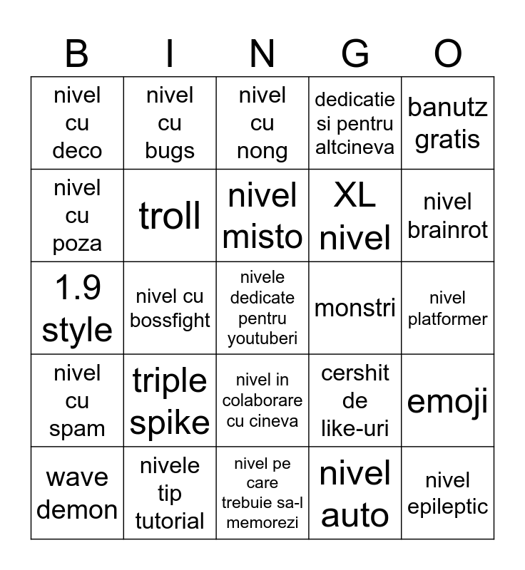 This bingo card has a free space and 24 words: triple spike, nivele tip tutorial, nivel misto, wave demon, banutz gratis, nivel cu deco, nivel cu poza, nivel cu bugs, monstri, nivel in colaborare cu cineva, XL nivel, 1.9 style, cershit de like-uri, emoji, troll, nivel auto, nivel platformer, nivel cu nong, nivel brainrot, nivel cu bossfight, nivel epileptic, nivel cu spam, dedicatie si pentru altcineva and nivel pe care trebuie sa-l memorezi.