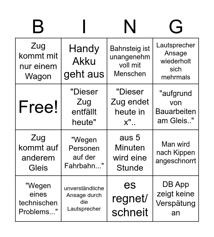 This bingo card has 16 words: unverständliche Ansage durch die Lautsprecher, Man wird nach Kippen angeschnorrt, Bahnsteig ist unangenehm voll mit Menschen, Zug kommt mit nur einem Wagon, Zug kommt auf anderem Gleis, Handy Akku geht aus, aus 5 Minuten wird eine Stunde, es regnet/ schneit, Free!, "Dieser Zug entfällt heute", "Wegen eines technischen Problems...", Lautsprecher Ansage wiederholt sich mehrmals, "Wegen Personen auf der Fahrbahn...", "aufgrund von Bauarbeiten am Gleis..", "Dieser Zug endet heute in x".. and DB App zeigt keine Verspätung an.