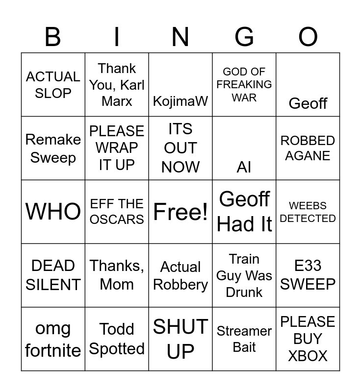 This bingo card has a free space and 24 words: Thanks, Mom, Todd Spotted, ITS OUT NOW, omg fortnite, Geoff, ACTUAL SLOP, Remake Sweep, Thank You, Karl Marx, Geoff Had It, Actual Robbery, AI, WHO, Train Guy Was Drunk, E33 SWEEP, PLEASE WRAP IT UP, Streamer Bait, WEEBS DETECTED, KojimaW, ROBBED AGANE, EFF THE OSCARS, PLEASE BUY XBOX, DEAD SILENT, GOD OF FREAKING WAR and SHUT UP.