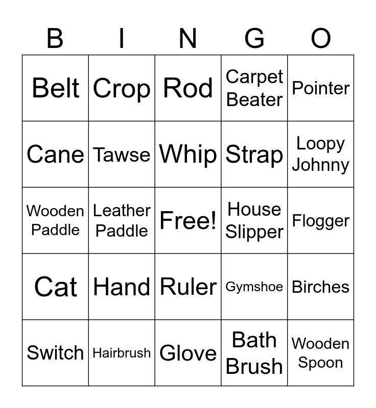 This bingo card has a free space and 24 words: Hand, Hairbrush, Whip, Switch, Pointer, Belt, Cane, Crop, House Slipper, Ruler, Strap, Wooden Paddle, Gymshoe, Birches, Tawse, Bath Brush, Flogger, Rod, Loopy Johnny, Leather Paddle, Wooden Spoon, Cat, Carpet Beater and Glove.