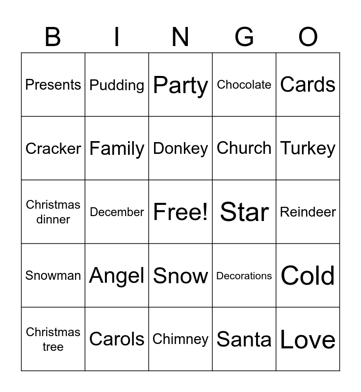 This bingo card has a free space and 24 words: Angel, Carols, Donkey, Christmas tree, Cards, Presents, Cracker, Pudding, Star, Snow, Church, Christmas dinner, Decorations, Cold, Family, Santa, Reindeer, Party, Turkey, December, Love, Snowman, Chocolate and Chimney.
