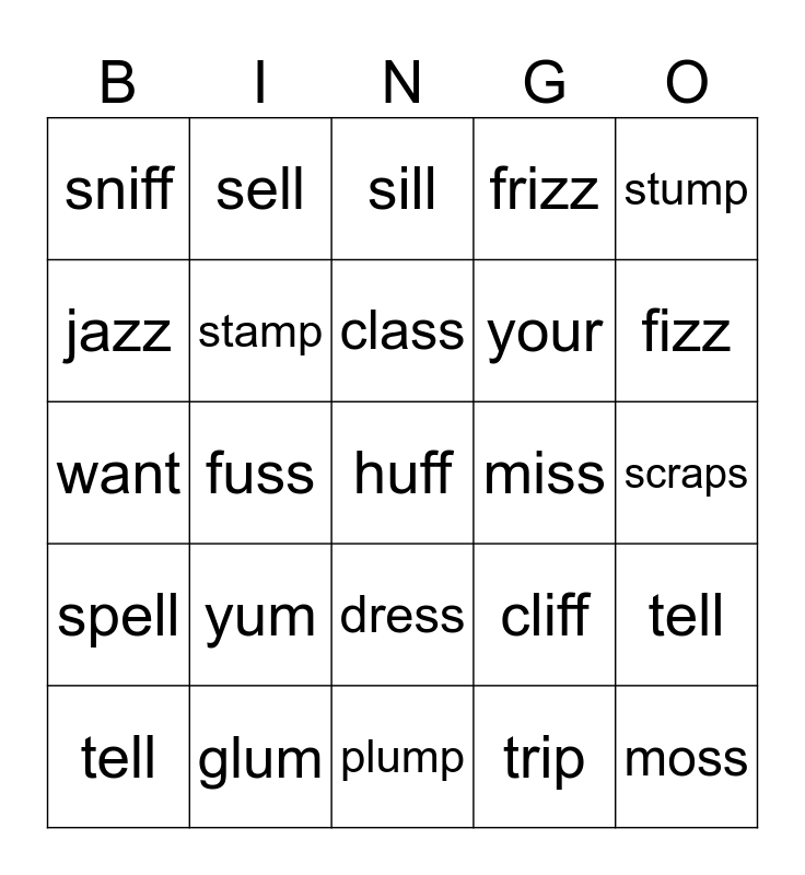 This bingo card has a free space and 24 words: yum, glum, class, tell, stump, sniff, jazz, sell, miss, dress, your, want, cliff, tell, stamp, trip, scraps, sill, fizz, fuss, moss, spell, frizz and plump.