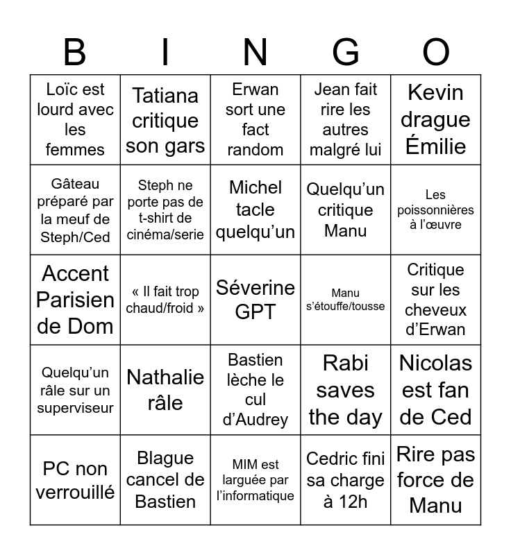 This bingo card has a free space and 24 words: Nathalie râle, Blague cancel de Bastien, Michel tacle quelqu’un, PC non verrouillé, Kevin drague Émilie, Loïc est lourd avec les femmes, Gâteau préparé par la meuf de Steph/Ced, Tatiana critique son gars, Manu s’étouffe/tousse, Bastien lèche le cul d’Audrey, Quelqu’un critique Manu, Accent Parisien de Dom, Rabi saves the day, Nicolas est fan de Ced, Steph ne porte pas de t-shirt de cinéma/serie, Cedric fini sa charge à 12h, Critique sur les cheveux d’Erwan, Erwan sort une fact random, Les poissonnières à l’œuvre, « Il fait trop chaud/froid », Rire pas force de Manu, Quelqu’un râle sur un superviseur, Jean fait rire les autres malgré lui and MIM est larguée par l’informatique.