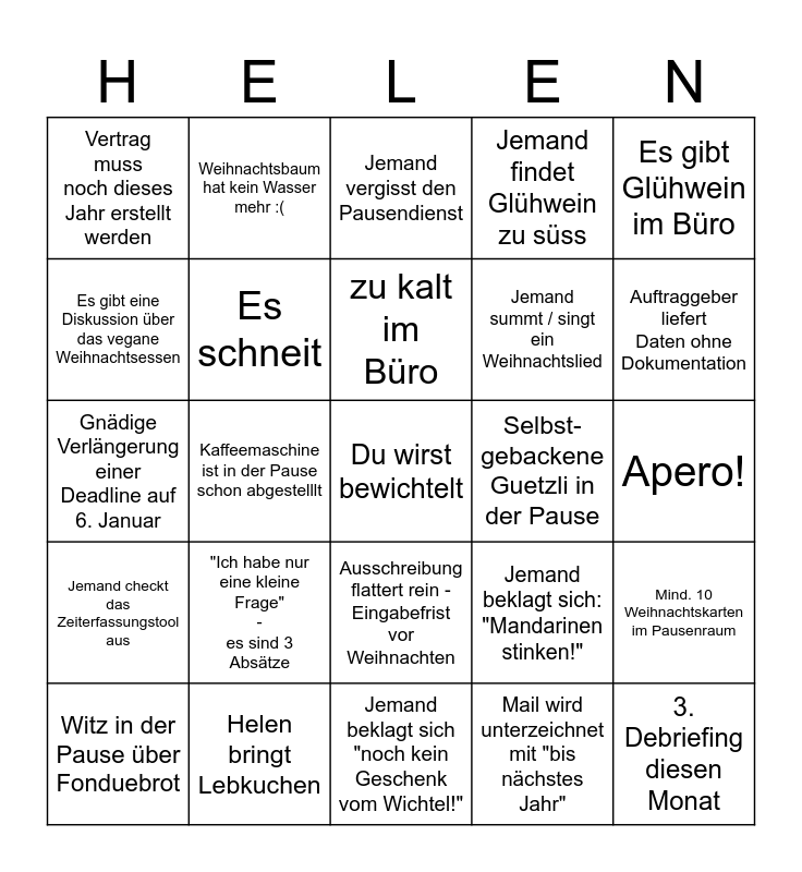 This bingo card has a free space and 24 words: "Ich habe nur eine kleine Frage" - es sind 3 Absätze, Helen bringt Lebkuchen, zu kalt im Büro, Witz in der Pause über Fonduebrot, Es gibt Glühwein im Büro, Vertrag muss noch dieses Jahr erstellt werden, Es gibt eine Diskussion über das vegane Weihnachtsessen, Weihnachtsbaum hat kein Wasser mehr :(, Selbst- gebackene Guetzli in der Pause, Ausschreibung flattert rein - Eingabefrist vor Weihnachten, Jemand summt / singt ein Weihnachtslied, Gnädige Verlängerung einer Deadline auf 6. Januar, Jemand beklagt sich: "Mandarinen stinken!", Mind. 10 Weihnachtskarten im Pausenraum, Es schneit, Mail wird unterzeichnet mit "bis nächstes Jahr", Apero!, Jemand vergisst den Pausendienst, Auftraggeber liefert Daten ohne Dokumentation, Kaffeemaschine ist in der Pause schon abgestelllt, 3. Debriefing diesen Monat, Jemand checkt das Zeiterfassungstool aus, Jemand findet Glühwein zu süss and Jemand beklagt sich "noch kein Geschenk vom Wichtel!".