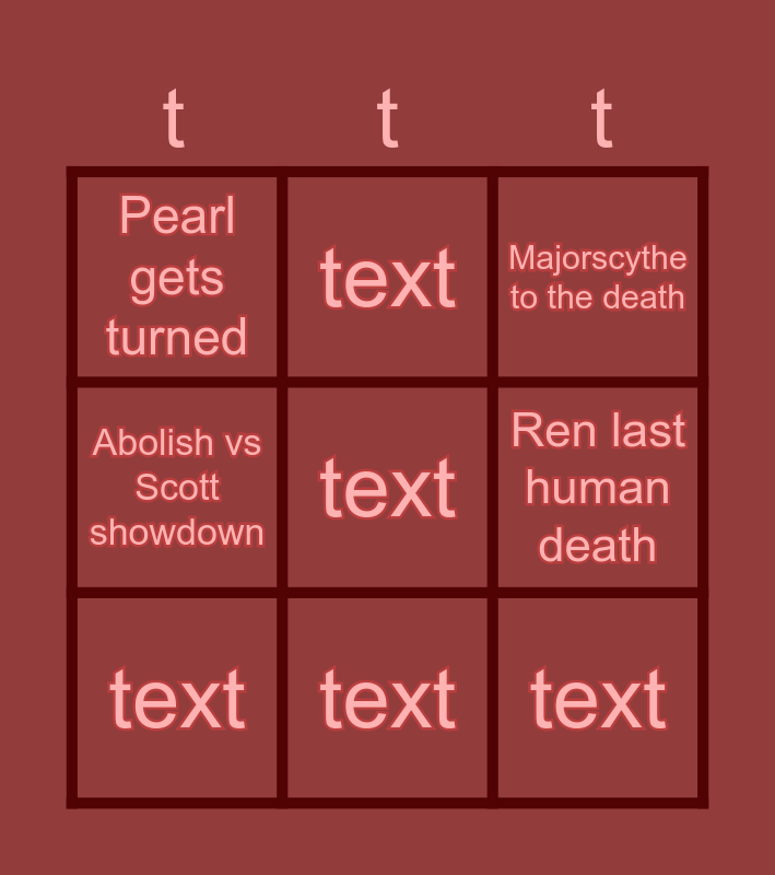 This bingo card has 41 words: text, text, text, Pearl gets turned, The castle is destroyed, text, Abolish vs Scott showdown, Apo makes it home to Cherri, text, Pyro dies violently, Shelby + Drift + Scott team up, Ren last human death, text, text, text, Only one person survives, The square hole kills again, Majorscythe to the death, Scott gets to monologue, text, text, text, text, text, text, text, text, text, text, text, text, text, text, text, text, text, text, text, text, text and text.