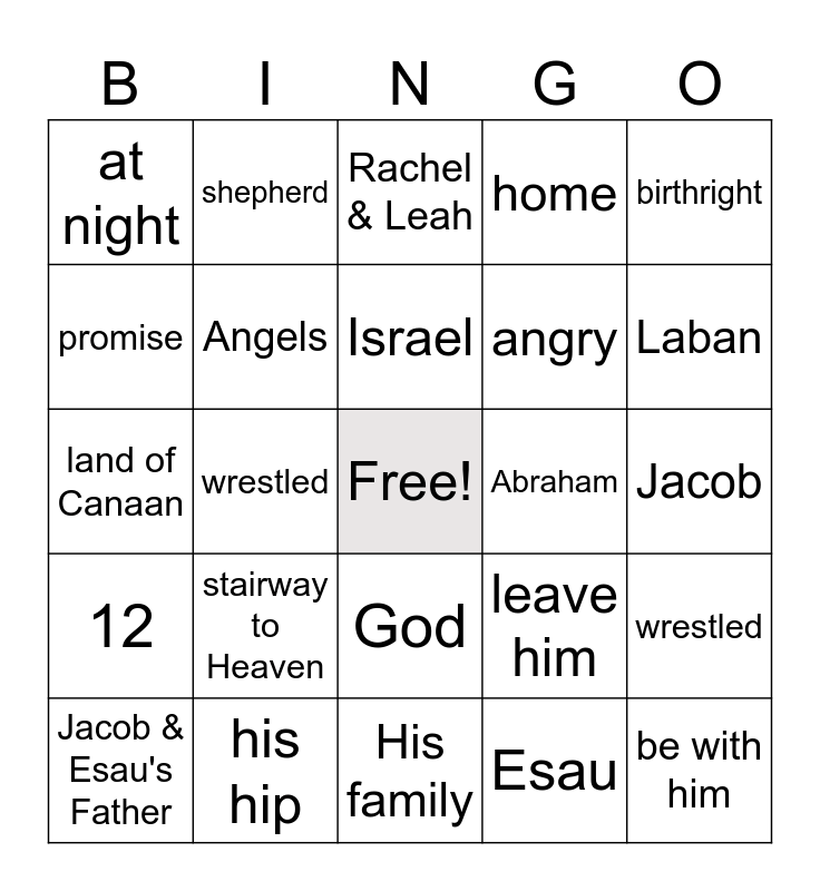 This bingo card has a free space and 24 words: stairway to Heaven, his hip, Israel, Jacob & Esau's Father, birthright, at night, promise, shepherd, Abraham, God, angry, land of Canaan, leave him, wrestled, Angels, Esau, Jacob, Rachel & Leah, Laban, wrestled, be with him, 12, home and His family.