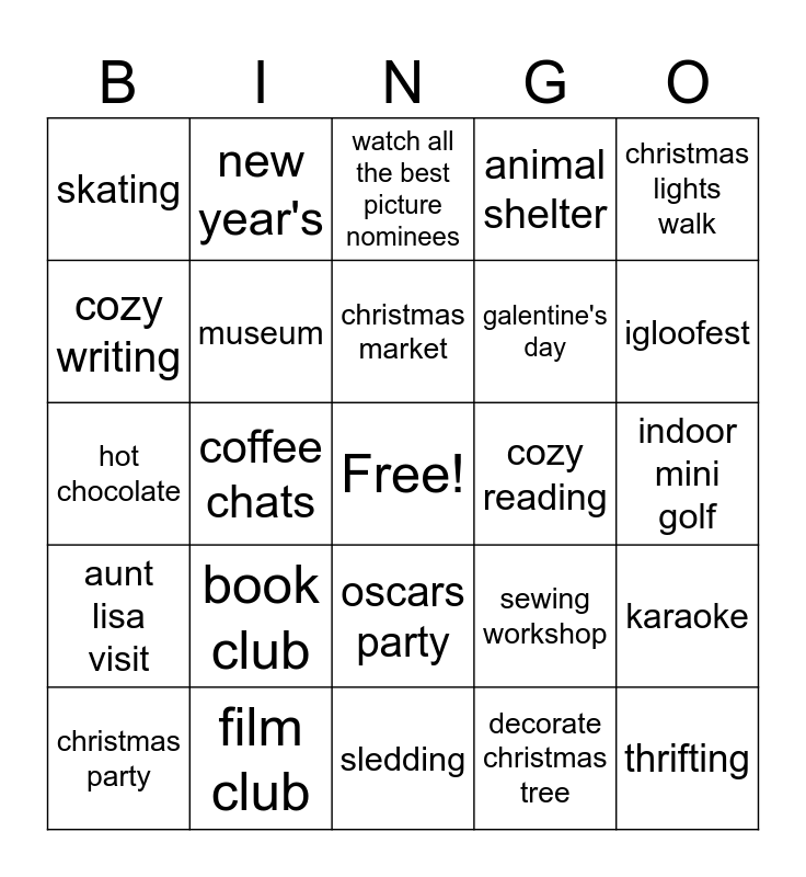 This bingo card has a free space and 24 words: book club, film club, christmas market, christmas party, christmas lights walk, skating, cozy writing, new year's, cozy reading, oscars party, galentine's day, hot chocolate, sewing workshop, karaoke, museum, decorate christmas tree, indoor mini golf, watch all the best picture nominees, igloofest, coffee chats, thrifting, aunt lisa visit, animal shelter and sledding.