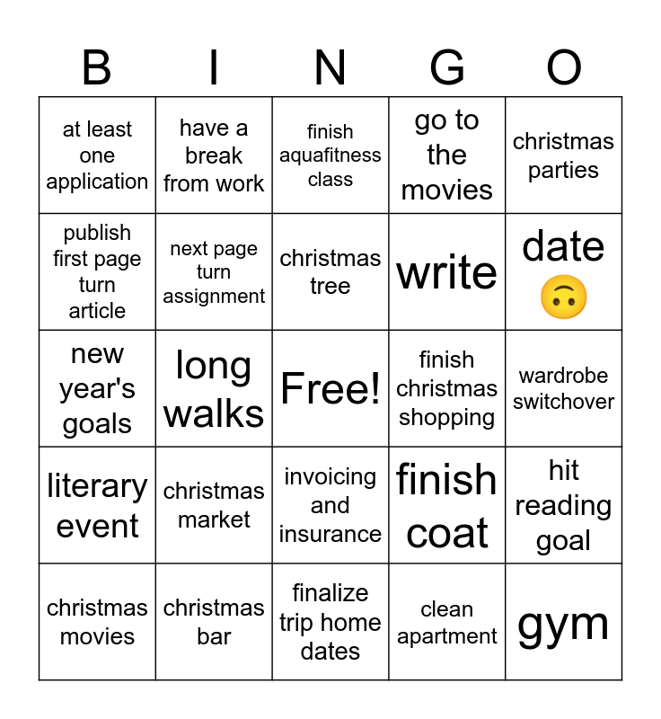 This bingo card has a free space and 24 words: christmas market, christmas bar, christmas tree, christmas movies, christmas parties, at least one application, publish first page turn article, have a break from work, finish christmas shopping, invoicing and insurance, write, new year's goals, finish coat, hit reading goal, next page turn assignment, clean apartment, wardrobe switchover, finish aquafitness class, date 🙃, long walks, gym, literary event, go to the movies and finalize trip home dates.