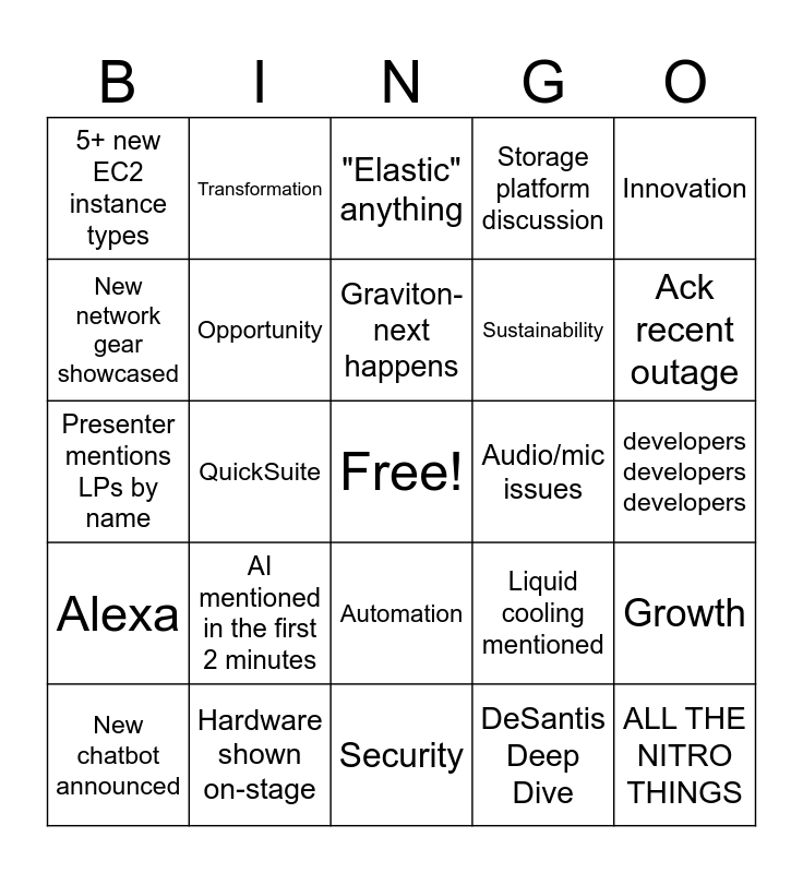 This bingo card has a free space and 24 words: AI mentioned in the first 2 minutes, Hardware shown on-stage, Graviton-next happens, New chatbot announced, Innovation, 5+ new EC2 instance types, New network gear showcased, Transformation, Audio/mic issues, Automation, Sustainability, Presenter mentions LPs by name, Liquid cooling mentioned, Growth, Opportunity, DeSantis Deep Dive, developers developers developers, "Elastic" anything, Ack recent outage, QuickSuite, ALL THE NITRO THINGS, Alexa, Storage platform discussion and Security.