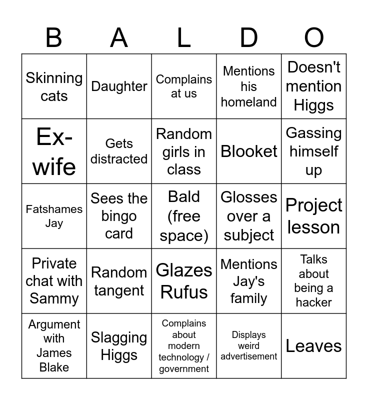 This bingo card has a free space and 24 words: Random tangent, Slagging Higgs, Random girls in class, Argument with James Blake, Doesn't mention Higgs, Skinning cats, Ex-wife, Daughter, Glosses over a subject, Glazes Rufus, Blooket, Fatshames Jay, Mentions Jay's family, Talks about being a hacker, Gets distracted, Displays weird advertisement, Project lesson, Complains at us, Gassing himself up, Sees the bingo card, Leaves, Private chat with Sammy, Mentions his homeland and Complains about modern technology / government.
