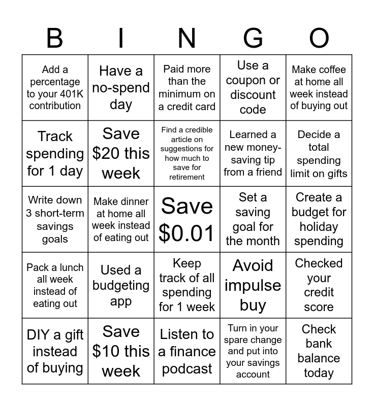 This bingo card has a free space and 41 words: Open or add to a savings account, Write down 3 short-term savings goals, Write down 3 long-term savings goals, Save $20 this week, Save $10 this week, Keep track of all spending for 1 week, Find a credible article on suggestions for how much to save for retirement, Donate or sell items you no longer need, Make coffee at home all week instead of buying out, Pack a lunch all week instead of eating out, Make dinner at home all week instead of eating out, Use a coupon or discount code, Check bank balance today, Create a budget for holiday spending, Set a saving goal for the month, Used a budgeting app, Contribute to retirement accounts (401K), Add a percentage to your 401K contribution, Learn about a new investment option, Paid more than the minimum on a credit card, Checked your credit score, Read an article about personal finance, Listen to a finance podcast, Learned a new money-saving tip from a friend, Shop with a list, Find a generic/cheaper substitute for a product you use, Turn in your spare change and put into your savings account, Track your subscriptions & remove any unused, Decide a total spending limit on gifts, Compare prices before buying an item, Add to your emergency fund, Have a no-spend day, DIY a gift instead of buying, Sell an unused item, Avoid impulse buy, Track spending for 1 day, set up automatic transfer to your savings account, Use a cashback app, Avoid dining out this weekend, Buy an item second-hand or refurbished instead of new and Unplug electronics when not in use.