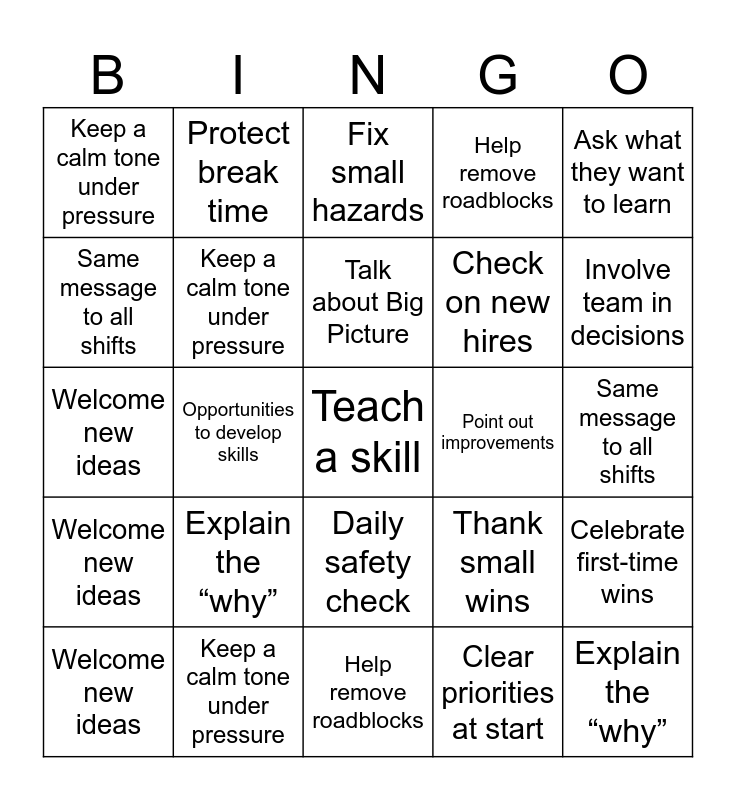 This bingo card has 75 words: Shift plan shared, Daily safety check, Fix small hazards, Give heads-up on changes, Predictable schedule, Say good morning, Ask “How’s your day?”, Thank small wins, Involve team in decisions, Check on new hires, Explain the “why”, Keep commitments, Talk about Big Picture, Same message to all shifts, Clear priorities at start, Opportunities to develop skills, Point out improvements, Teach a skill, Link work to customer, Ask what they want to learn, Ask how are you, Welcome new ideas, Keep a calm tone under pressure, Protect break time, Help remove roadblocks, Recognize teamwork, Shift plan shared, Daily safety check, Fix small hazards, Give heads-up on changes, Predictable schedule, Say good morning, Ask “How’s your day?”, Thank small wins, Involve team in decisions, Check on new hires, Explain the “why”, Employees feel safe to say "no", Same message to all shifts, Clear priorities at start, Recognize teamwork, Point out improvements, Teach a skill, Link work to customer, Ask what they want to learn, Celebrate small wins, Welcome new ideas, Keep a calm tone under pressure, Protect break time, Help remove roadblocks, Ask how are you, Daily safety check, Fix small hazards, Give heads-up on changes, Predictable schedule, Say good morning, Ask “How’s your day?”, Thank small wins, Involve team in decisions, Check on new hires, Explain the “why”, Keep commitments, Same message to all shifts, Clear priorities at start, Talk about Big Picture, Point out improvements, Teach a skill, Link work to customer, Ask what they want to learn, Celebrate first-time wins, Welcome new ideas, Keep a calm tone under pressure, Protect break time, Help remove roadblocks and Recognize teamwork.
