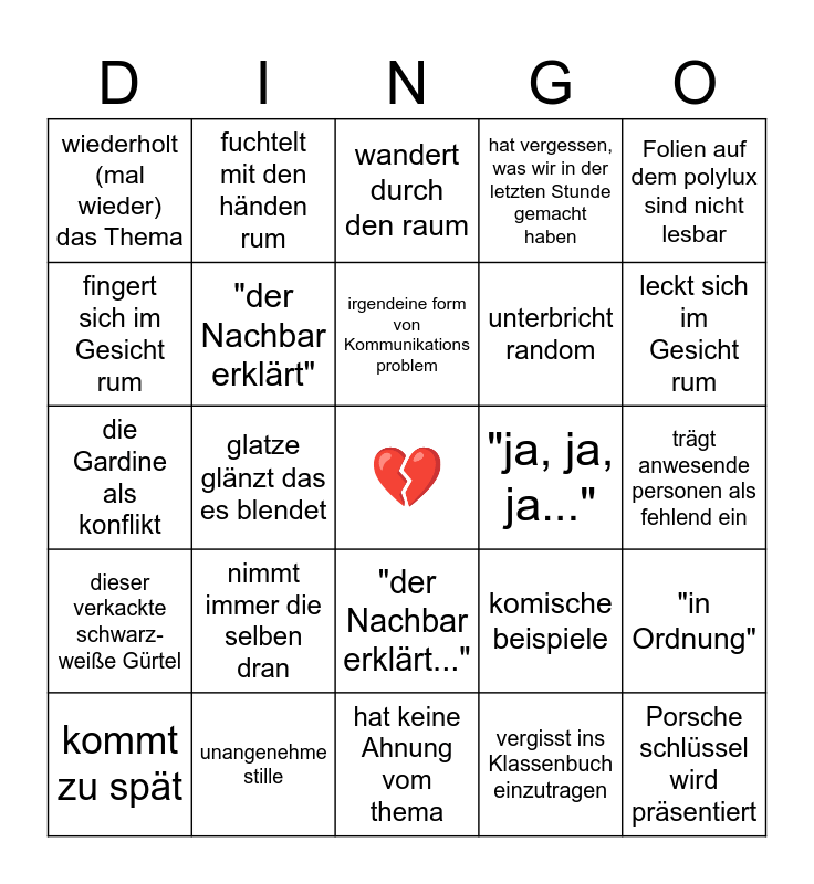 This bingo card has a free space and 24 words: nimmt immer die selben dran, unangenehme stille, irgendeine form von Kommunikations problem, kommt zu spät, Folien auf dem polylux sind nicht lesbar, wiederholt (mal wieder) das Thema, fingert sich im Gesicht rum, fuchtelt mit den händen rum, "ja, ja, ja...", "der Nachbar erklärt...", unterbricht random, die Gardine als konflikt, komische beispiele, "in Ordnung", "der Nachbar erklärt", vergisst ins Klassenbuch einzutragen, trägt anwesende personen als fehlend ein, wandert durch den raum, leckt sich im Gesicht rum, glatze glänzt das es blendet, Porsche schlüssel wird präsentiert, dieser verkackte schwarz-weiße Gürtel, hat vergessen, was wir in der letzten Stunde gemacht haben and hat keine Ahnung vom thema.