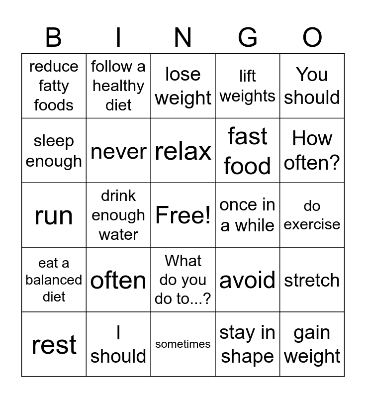 This bingo card has a free space and 26 words: What do you do to...?, stay in shape, relax, I should, You should, reduce fatty foods, sleep enough, follow a healthy diet, do exercise, avoid, fast food, run, stretch, rest, drink enough water, meditate, lift weights, eat a balanced diet, lose weight, gain weight, How often?, sometimes, once in a while, often, never and everyday.