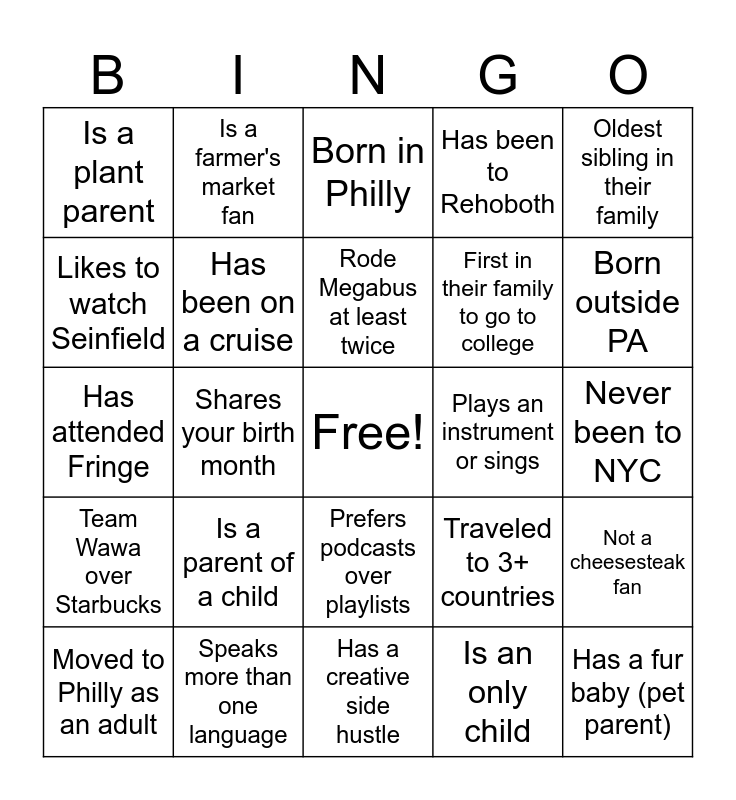 This bingo card has a free space and 29 words: Relies on SEPTA regularly, Speaks more than one language, Born in Philly, Prefers early mornings to late nights, Oldest sibling in their family, Is a plant parent, Has been on a cruise, Rode Megabus at least twice, Plays an instrument or sings, Not a cheesesteak fan, Moved to Philly as an adult, Shares your birth month, Is an only child, Has a fur baby (pet parent), Has attended Fringe, Loves Rita’s Water Ice, Has a creative side hustle, Traveled to 3+ countries, Born outside PA, Team Wawa over Starbucks, Is a parent of a child, Prefers tea over coffee, First in their family to go to college, Never been to NYC, Likes to watch Seinfield, Is a farmer's market fan, Prefers podcasts over playlists, Has been to Rehoboth and Likes the same snacks as you.