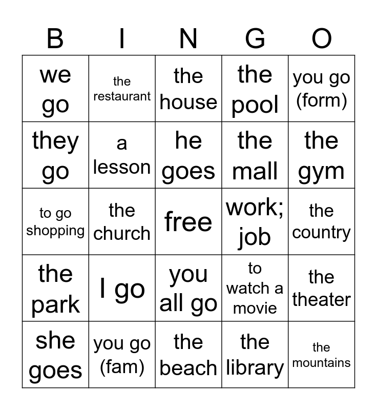 This bingo card has a free space and 24 words: I go, you go (fam), he goes, she goes, you go (form), we go, they go, the restaurant, work; job, you all go, the mall, to go shopping, to watch a movie, the theater, a lesson, the library, the country, the house, the gym, the church, the mountains, the park, the pool and the beach.