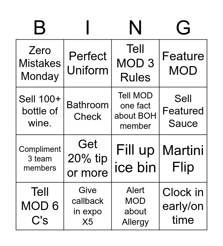 This bingo card has 20 words: Martini Flip, Linen Replacement, Tell MOD 3 Rules, Rack to the front., Tell MOD 6 C's, Sell 100+ bottle of wine., Give callback in expo X5, Zero Mistakes Monday, Compliment 3 team members, Perfect Uniform, Get 20% tip or more, Fill up ice bin, Bathroom Check, Clock in early/on time, Tell MOD one fact about BOH member, Lead guest to destination, Sell Featured Sauce, Feature MOD, Alert MOD about Allergy and Free Space!.