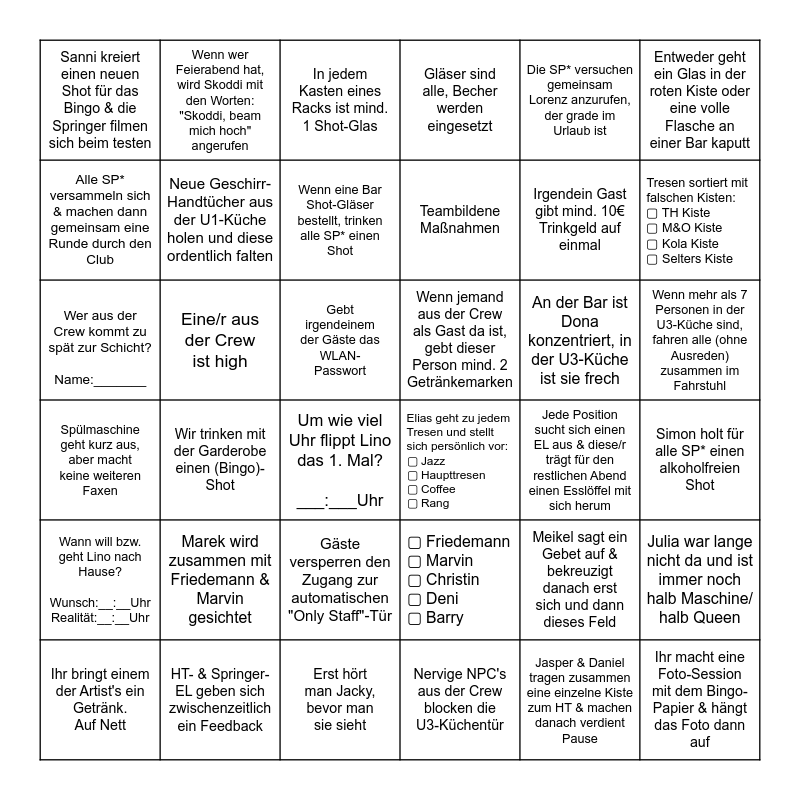 This bingo card has 36 words: ▢ Friedemann ▢ Marvin ▢ Christin ▢ Deni ▢ Barry, Gäste versperren den Zugang zur automatischen "Only Staff"-Tür, Nervige NPC's aus der Crew blocken die U3-Küchentür, Alle SP* versammeln sich & machen dann gemeinsam eine Runde durch den Club, Spülmaschine geht kurz aus, aber macht keine weiteren Faxen, Wenn jemand aus der Crew als Gast da ist, gebt dieser Person mind. 2 Getränkemarken, Neue Geschirr-Handtücher aus der U1-Küche holen und diese ordentlich falten, Erst hört man Jacky, bevor man sie sieht, Die SP* versuchen gemeinsam Lorenz anzurufen, der grade im Urlaub ist, Meikel sagt ein Gebet auf & bekreuzigt danach erst sich und dann dieses Feld, Tresen sortiert mit falschen Kisten: ▢ TH Kiste ▢ M&O Kiste ▢ Kola Kiste ▢ Selters Kiste, Gläser sind alle, Becher werden eingesetzt, Julia war lange nicht da und ist immer noch halb Maschine/ halb Queen, Eine/r aus der Crew ist high, Teambildene Maßnahmen, Sanni kreiert einen neuen Shot für das Bingo & die Springer filmen sich beim testen, Wann will bzw. geht Lino nach Hause? Wunsch:__:__Uhr Realität:__:__Uhr, An der Bar ist Dona konzentriert, in der U3-Küche ist sie frech, Wer aus der Crew kommt zu spät zur Schicht? Name:_______, In jedem Kasten eines Racks ist mind. 1 Shot-Glas, Gebt irgendeinem der Gäste das WLAN-Passwort, Wir trinken mit der Garderobe einen (Bingo)-Shot, Elias geht zu jedem Tresen und stellt sich persönlich vor: ▢ Jazz ▢ Haupttresen ▢ Coffee ▢ Rang, Um wie viel Uhr flippt Lino das 1. Mal? ___:___Uhr, Jede Position sucht sich einen EL aus & diese/r trägt für den restlichen Abend einen Esslöffel mit sich herum, Wenn wer Feierabend hat, wird Skoddi mit den Worten: "Skoddi, beam mich hoch" angerufen, Irgendein Gast gibt mind. 10€ Trinkgeld auf einmal, HT- & Springer- EL geben sich zwischenzeitlich ein Feedback, Wenn eine Bar Shot-Gläser bestellt, trinken alle SP* einen Shot, Entweder geht ein Glas in der roten Kiste oder eine volle Flasche an einer Bar kaputt, Ihr macht eine Foto-Session mit dem Bingo-Papier & hängt das Foto dann auf, Ihr bringt einem der Artist's ein Getränk. Auf Nett, Simon holt für alle SP* einen alkoholfreien Shot, Wenn mehr als 7 Personen in der U3-Küche sind, fahren alle (ohne Ausreden) zusammen im Fahrstuhl, Marek wird zusammen mit Friedemann & Marvin gesichtet and Jasper & Daniel tragen zusammen eine einzelne Kiste zum HT & machen danach verdient Pause.