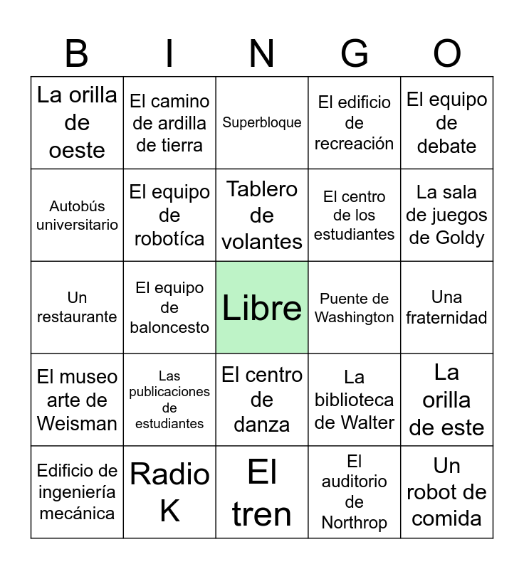 This bingo card has a free space and 27 words: La biblioteca de Walter, El estadio de Huntington, El centro de los estudiantes, El tren, Autobús universitario, Superbloque, El camino de ardilla de tierra, El museo arte de Weisman, Puente de Washington, La orilla de este, Un restaurante, El edificio de recreación, Edificio de ingeniería mecánica, Radio K, La sala de juegos de Goldy, La mascota, El equipo de robotíca, Tablero de volantes, Las publicaciones de estudiantes, La orilla de oeste, Una fraternidad, El auditorio de Northrop, El equipo de baloncesto, Un robot de comida, El centro de danza, El equipo de debate and El equipo de ajedrez.