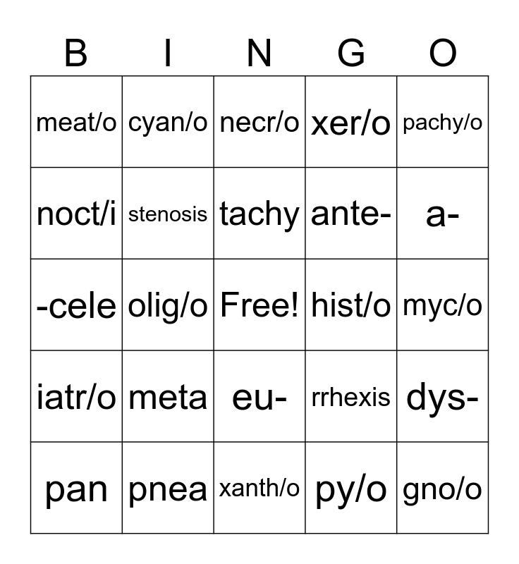 This bingo card has a free space and 24 words: meta, pnea, tachy, pan, pachy/o, meat/o, noct/i, cyan/o, hist/o, eu-, ante-, -cele, rrhexis, dys-, stenosis, py/o, myc/o, necr/o, a-, olig/o, gno/o, iatr/o, xer/o and xanth/o.