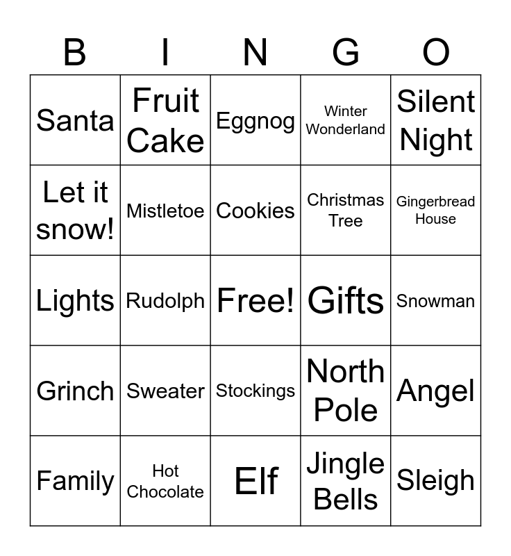 This bingo card has a free space and 24 words: Sweater, Hot Chocolate, Cookies, Family, Silent Night, Santa, Let it snow!, Fruit Cake, Gifts, Stockings, Christmas Tree, Lights, North Pole, Angel, Mistletoe, Jingle Bells, Snowman, Eggnog, Gingerbread House, Rudolph, Sleigh, Grinch, Winter Wonderland and Elf.