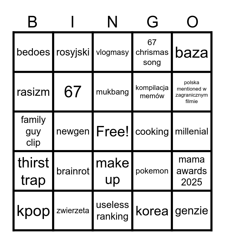 This bingo card has a free space and 24 words: kpop, brainrot, mukbang, korea, baza, bedoes, rosyjski, vlogmasy, cooking, millenial, family guy clip, 67, pokemon, mama awards 2025, rasizm, zwierzeta, useless ranking, 67 chrismas song, polska mentioned w zagranicznym filmie, thirst trap, newgen, make up, kompilacja memów and genzie.