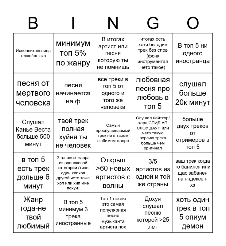 This bingo card has 44 words: В топе песня или исполнитель, которого слушал(-а) чисто из-за мемов, Самый прослушиваемый трек не в твоем любимом жанре, Один трек переслушивал(-а) больше 214 раз, Жанр года-не твой любимый, Слушал (заебался добавлять женские местоимения) много ониме или песен из игр, Дохуя слушал песню которой >25 лет, В итогах артист или песня которую ты не помнишь, Входишь в 0,5%, В топ 5 ни одного иностранца, В топ 5 минимум 3 трека иностранные, итогах есть хотя бы один трек без слов (фонк инструментал чето такое), Слушал найткор/хард СПИД АП СЛОУ ДАУН или чето такую версию трека больше чем оригинал, Открыл >60 новых артистов с волны, 2 топовых жанра из одинаковой категории (типо один хипхоп другой чето тоже хоп или хип мне похуй), Есть хотя бы один артист с меньше чем 50к прослушиваний в топ 5, Топ 1 песня это самая популярная песня музыканта артиста пох, Больше 100 лайков на хуете какой нибудь или че там в Яндексе, Слушал Канье Веста больше 500 минут, Песня в топ 5 оказалось онли из-за одного ТОПмомента, слушал больше 20к минут, минимум топ 5% по жанру, СЛУШАЕШЬ СК ДОХУЯ (МЕДКИД И ТЕМНЫЙ ПРИНЦ УЖЕ НЕ СК ОНИ ЗАФОРШЕНЫ но Аляска куртка думаю можно посчитать как ск), телочья музыка там Валентин с тыкал пошлая моли я тоже слушаю их кстати я телка, Исполнительница телка/шлюха, есть серега пират в топ 5, больше двух треков от стримеров в топ 5, стример один из топ музыкантов, есть личи в топе (ЧИСТО ЧТОБЫ ЗАВАЛИТЬ КЛЕТКА), 3/5 артистов из одной и той же страны, в топ 5 есть трек дольше 6 минут, количество прослушанных жанров >30, ваш трек когда то банился или щас забанен на яндексе я хз, топ 1 трек не от топ 1 исполнителя, NPC, твой трек полная хуйня ты не человек, только телки в топ 5, только мужики в топ 5, хоть один трек в топ 5 опиум демон, все треки в топ 5 от одного и того же человека, песня от мертвого человека, любовная песня про любовь в топ 5, есть песня до 2 минут в топ 5, песня начинается на ф and песня начинается на т.