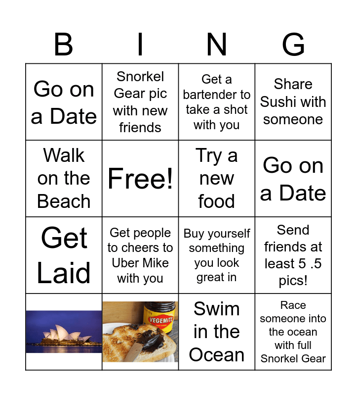This bingo card has 2 images and 14 words: Send friends at least 5 .5 pics!, Get a bartender to take a shot with you, Go on a Date, Get Laid, Snorkel Gear pic with new friends, Buy yourself something you look great in, Swim in the Ocean, Walk on the Beach, Free!, Share Sushi with someone, Get people to cheers to Uber Mike with you, Go on a Date, Try a new food and Race someone into the ocean with full Snorkel Gear.