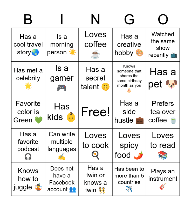 This bingo card has a free space and 24 words: Can write multiple languages โ๏ธ, Does not have a Facebook account ๐ฅ, Has a secret talent ๐คซ, Knows how to juggle ๐คน, Watched the same show recently ๐บ, Has a cool travel story๐, Has met a celebrity ๐, Is a morning person โ๏ธ, Has a side hustle ๐ผ, Loves to cook ๐ณ, Knows someone that shares the same birthday month as you ๐, Favorite color is Green ๐, Loves spicy food ๐ถ, Loves to read ๐, Is a gamer ๐ฎ, Has been to more than 5 countries โ๏ธ, Prefers tea over coffee ๐ต, Loves coffee โ, Has a pet ๐ถ, Has kids ๐ถ, Plays an instrument ๐ธ, Has a favorite podcast ๐ง, Has a creative hobby ๐จ and Has a twin or knows a twin ๐ฏ.