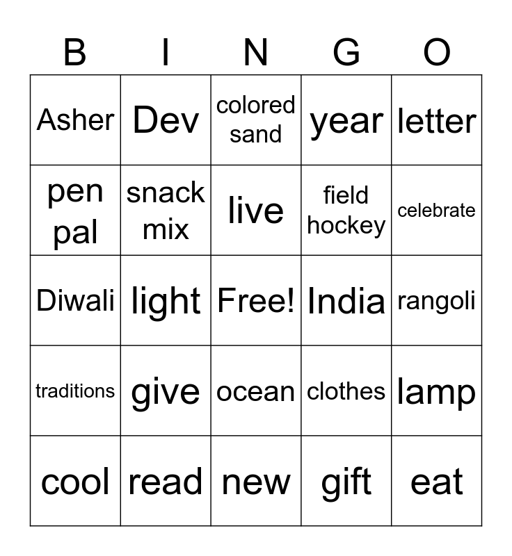 This bingo card has a free space and 24 words: give, read, live, cool, letter, Asher, pen pal, Dev, India, ocean, field hockey, Diwali, clothes, lamp, snack mix, gift, rangoli, colored sand, celebrate, light, eat, traditions, year and new.