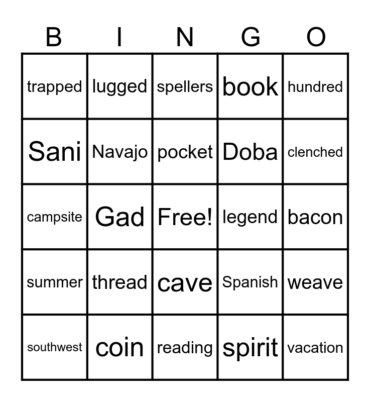 This bingo card has a free space and 24 words: thread, coin, pocket, southwest, hundred, trapped, Sani, lugged, legend, cave, Doba, campsite, Spanish, weave, Navajo, spirit, bacon, spellers, clenched, Gad, vacation, summer, book and reading.