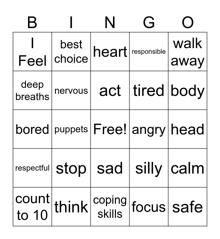 This bingo card has a free space and 24 words: stop, think, act, count to 10, walk away, I Feel, deep breaths, best choice, angry, sad, tired, bored, silly, calm, nervous, focus, head, heart, body, puppets, safe, respectful, responsible and coping skills.