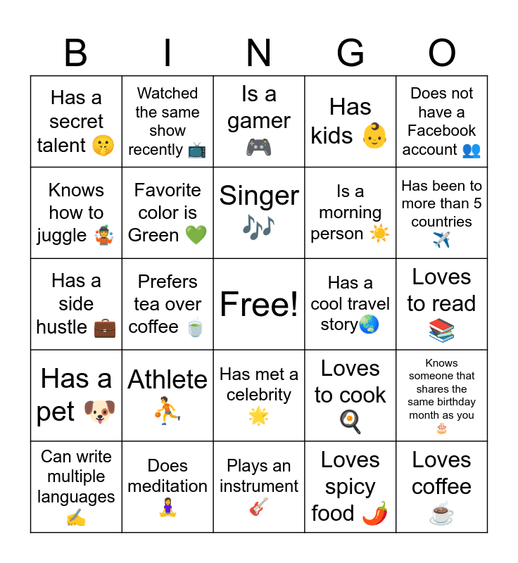 This bingo card has a free space and 24 words: Athlete โน๏ธ, Does meditation ๐งโโ๏ธ, Singer ๐ถ, Can write multiple languages โ๏ธ, Does not have a Facebook account ๐ฅ, Has a secret talent ๐คซ, Knows how to juggle ๐คน, Watched the same show recently ๐บ, Has a cool travel story๐, Has met a celebrity ๐, Is a morning person โ๏ธ, Has a side hustle ๐ผ, Loves to cook ๐ณ, Knows someone that shares the same birthday month as you ๐, Favorite color is Green ๐, Loves spicy food ๐ถ, Loves to read ๐, Is a gamer ๐ฎ, Has been to more than 5 countries โ๏ธ, Prefers tea over coffee ๐ต, Loves coffee โ, Has a pet ๐ถ, Has kids ๐ถ and Plays an instrument ๐ธ.