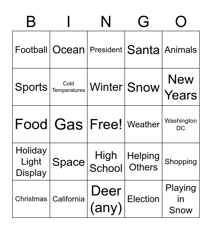 This bingo card has a free space and 24 words: Space, California, Winter, Christmas, Animals, Football, Sports, Ocean, Weather, High School, Snow, Food, Helping Others, Shopping, Cold Temperatures, Election, Washington DC, President, New Years, Gas, Playing in Snow, Holiday Light Display, Santa and Deer (any).