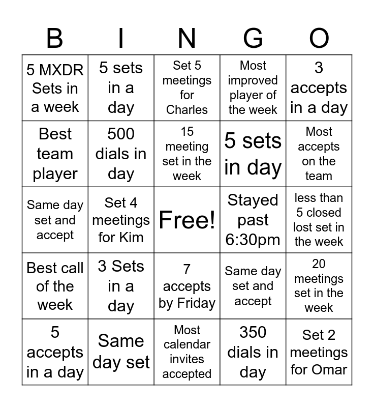This bingo card has a free space and 24 words: 3 Sets in a day, Same day set, 15 meeting set in the week, 5 accepts in a day, 3 accepts in a day, 5 MXDR Sets in a week, Best team player, 5 sets in a day, Stayed past 6:30pm, 7 accepts by Friday, 5 sets in day, Same day set and accept, Same day set and accept, 20 meetings set in the week, 500 dials in day, 350 dials in day, less than 5 closed lost set in the week, Set 5 meetings for Charles, Most accepts on the team, Set 4 meetings for Kim, Set 2 meetings for Omar, Best call of the week, Most improved player of the week and Most calendar invites accepted.