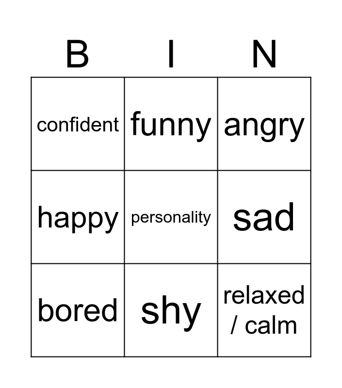 This bingo card has a free space and 8 words: sad, angry, funny, bored, confident, relaxed / calm, happy and shy.