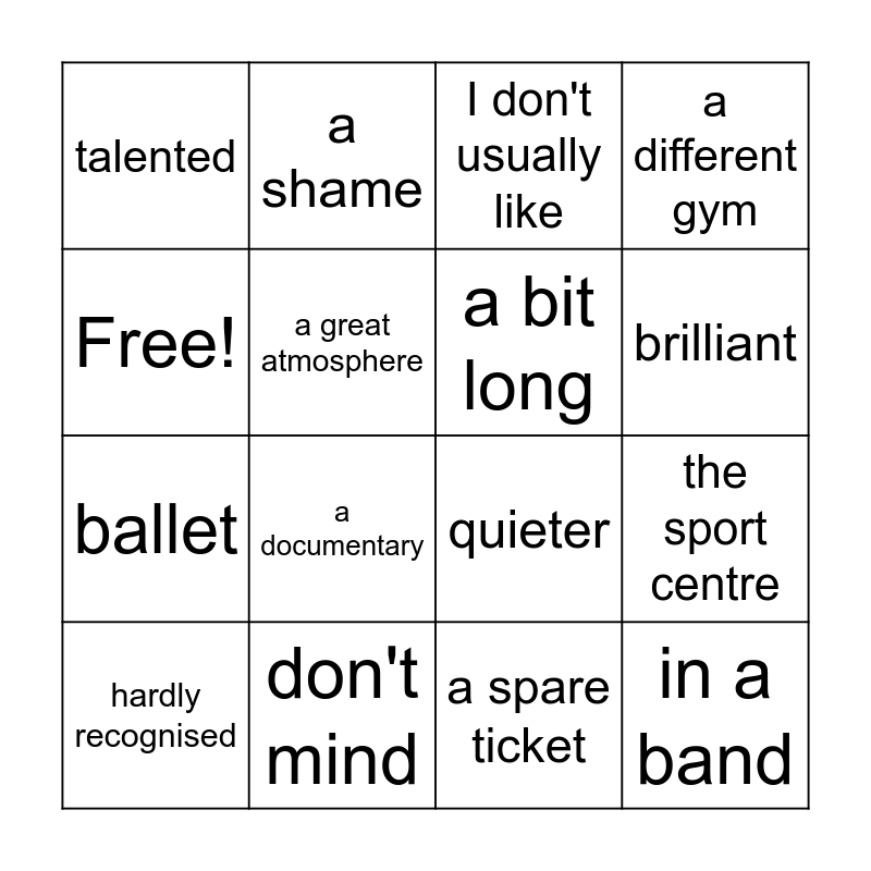 This bingo card has 16 words: don't mind, the sport centre, I don't usually like, talented, ballet, a shame, quieter, a spare ticket, Free!, a great atmosphere, hardly recognised, a different gym, a documentary, brilliant, a bit long and in a band.