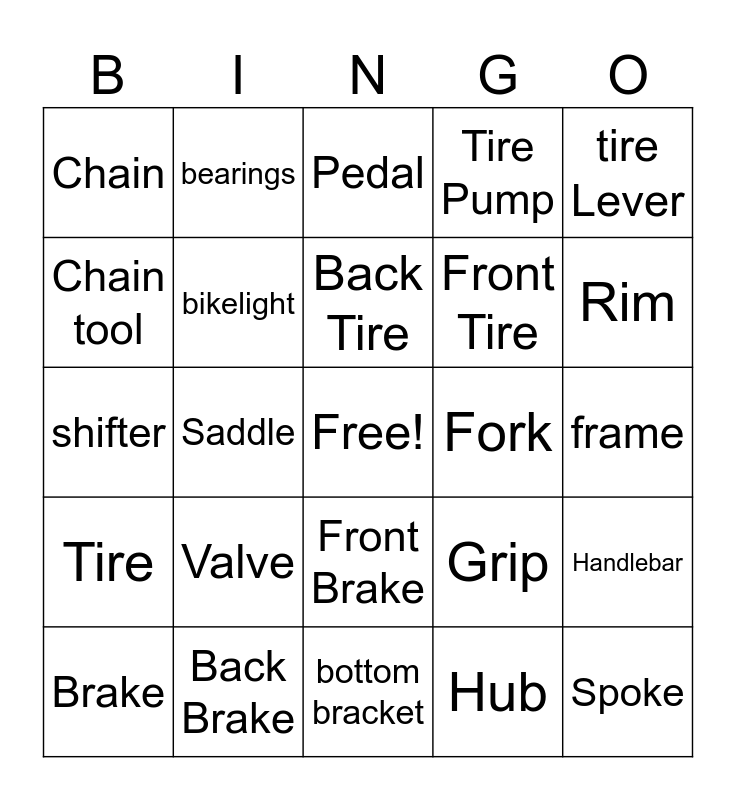 This bingo card has a free space and 24 words: Valve, Back Brake, Back Tire, Brake, tire Lever, Chain, Chain tool, bearings, Fork, Front Brake, Front Tire, shifter, Grip, Handlebar, bikelight, Hub, frame, Pedal, Rim, Saddle, Spoke, Tire, Tire Pump and bottom bracket.