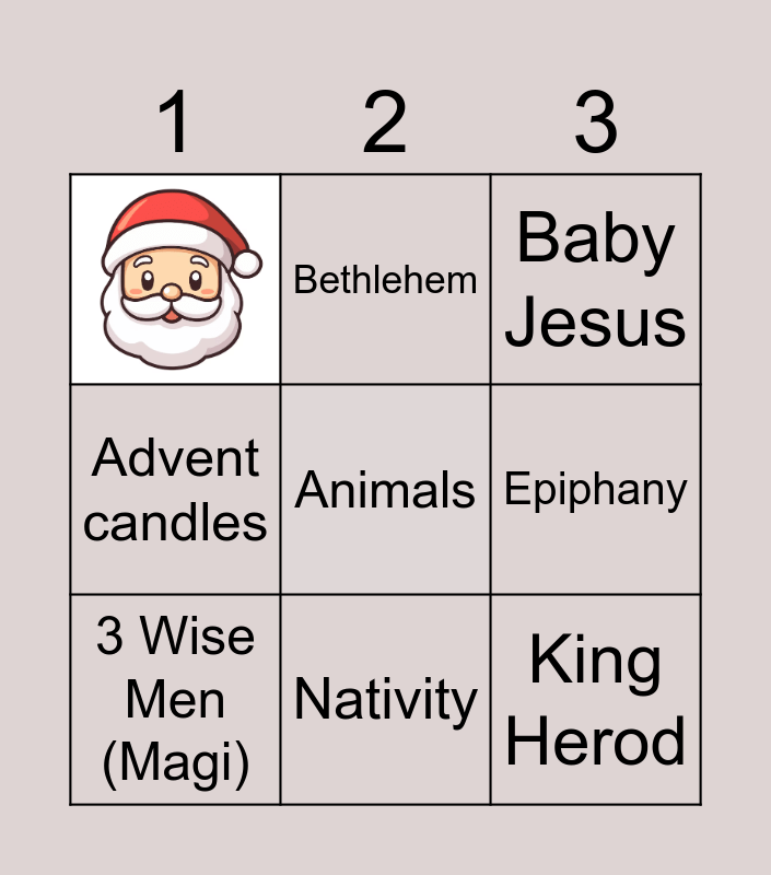 This bingo card has 1 images and 8 words: 3 Wise Men (Magi), Baby Jesus, Bethlehem, Advent candles, Epiphany, Animals, King Herod and Nativity.